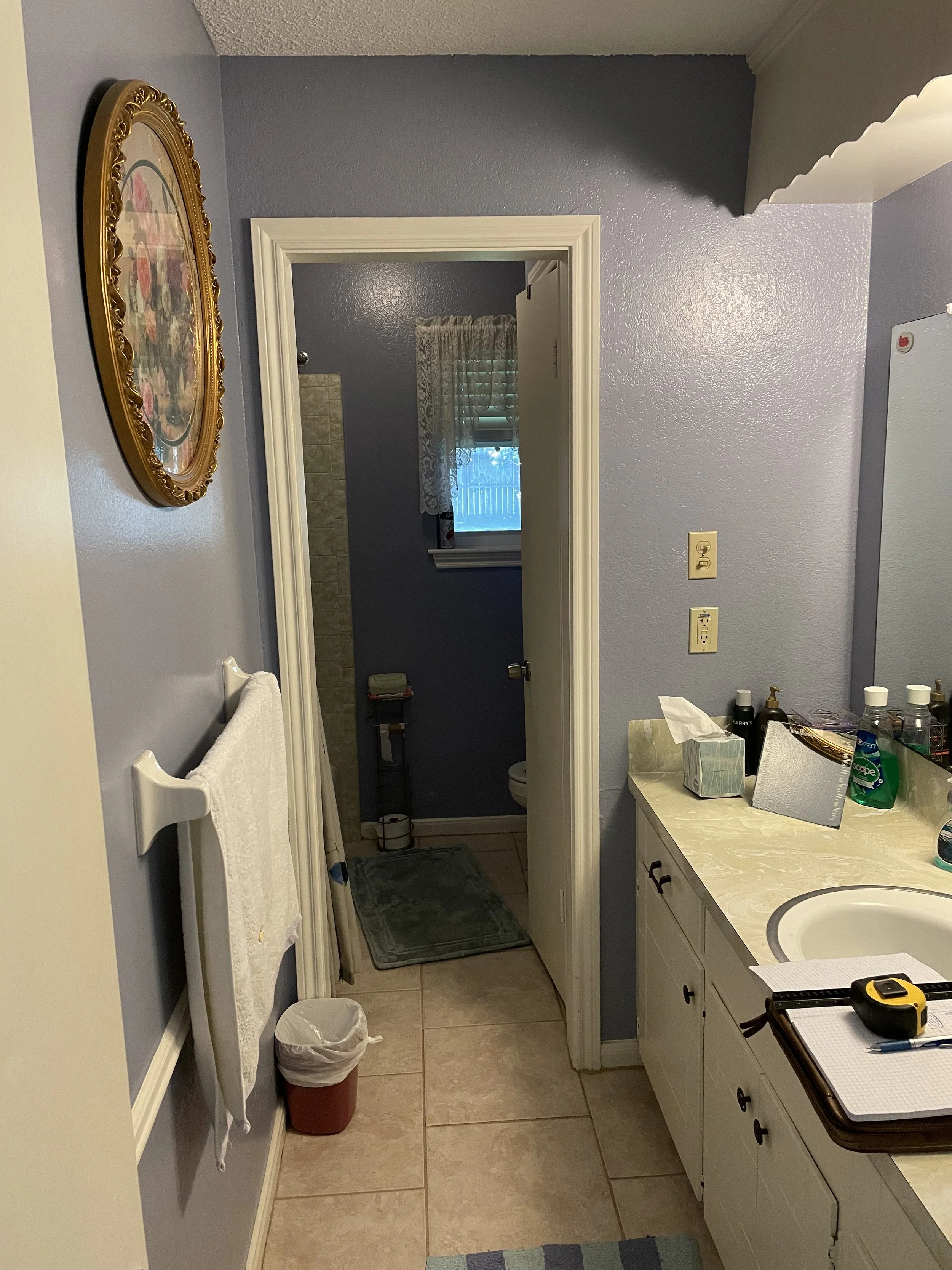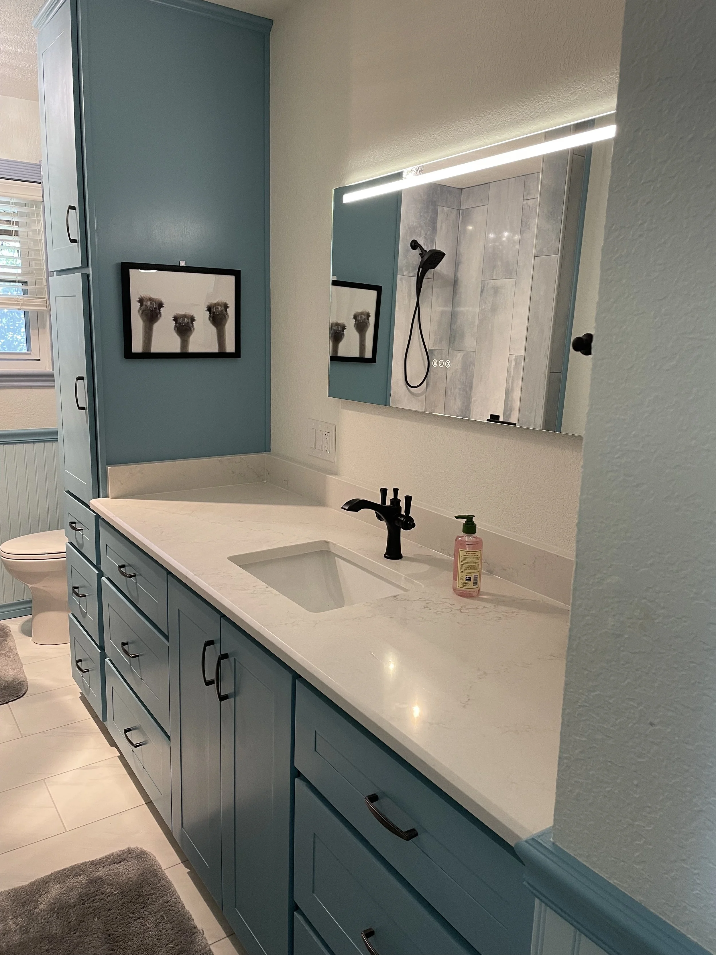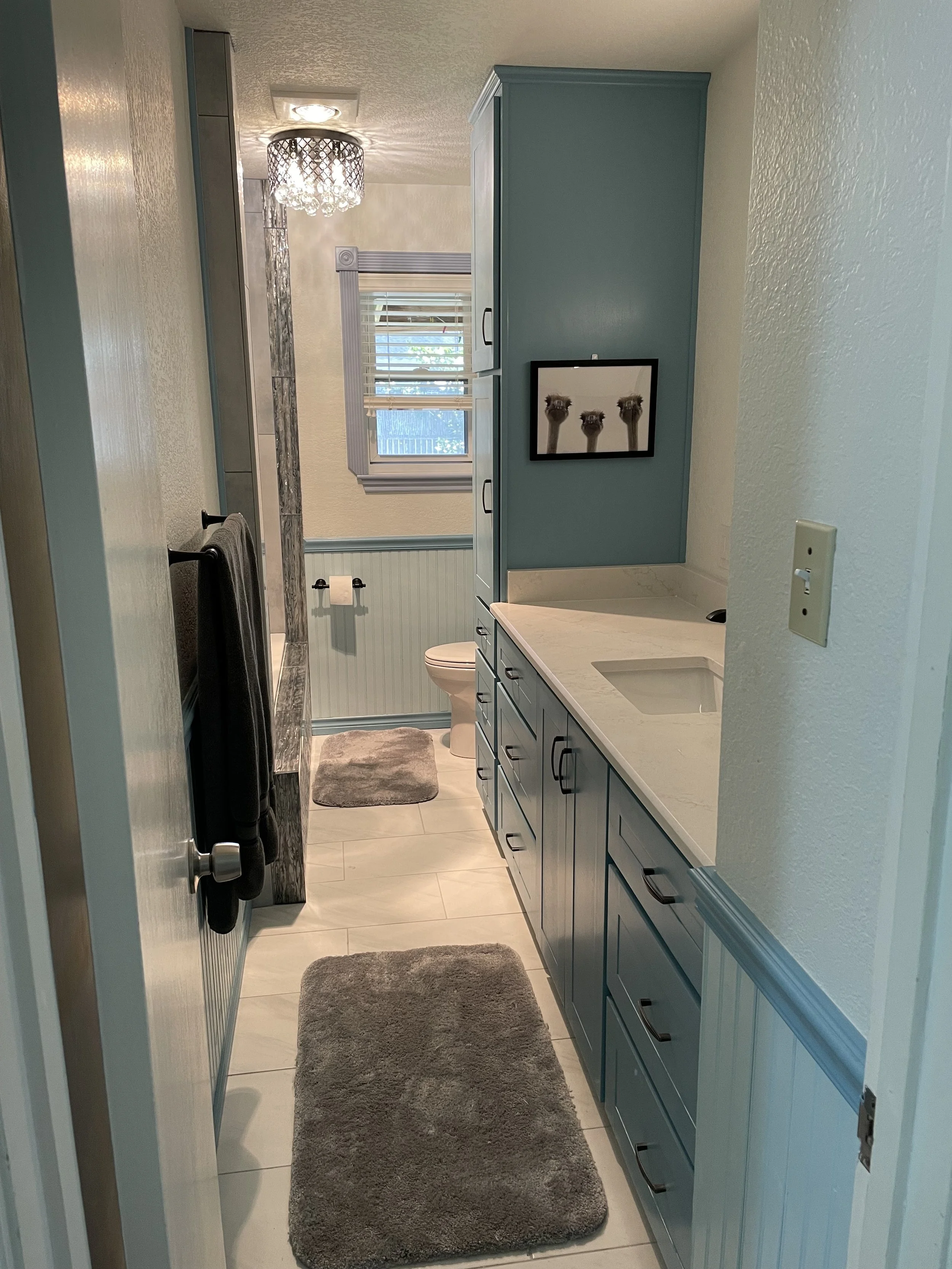 Creative tile choices make for a grand statement in this guest bathroom. Custom vanity, linen, and wainscoting with a bold color make for a fun and inviting bathroom.