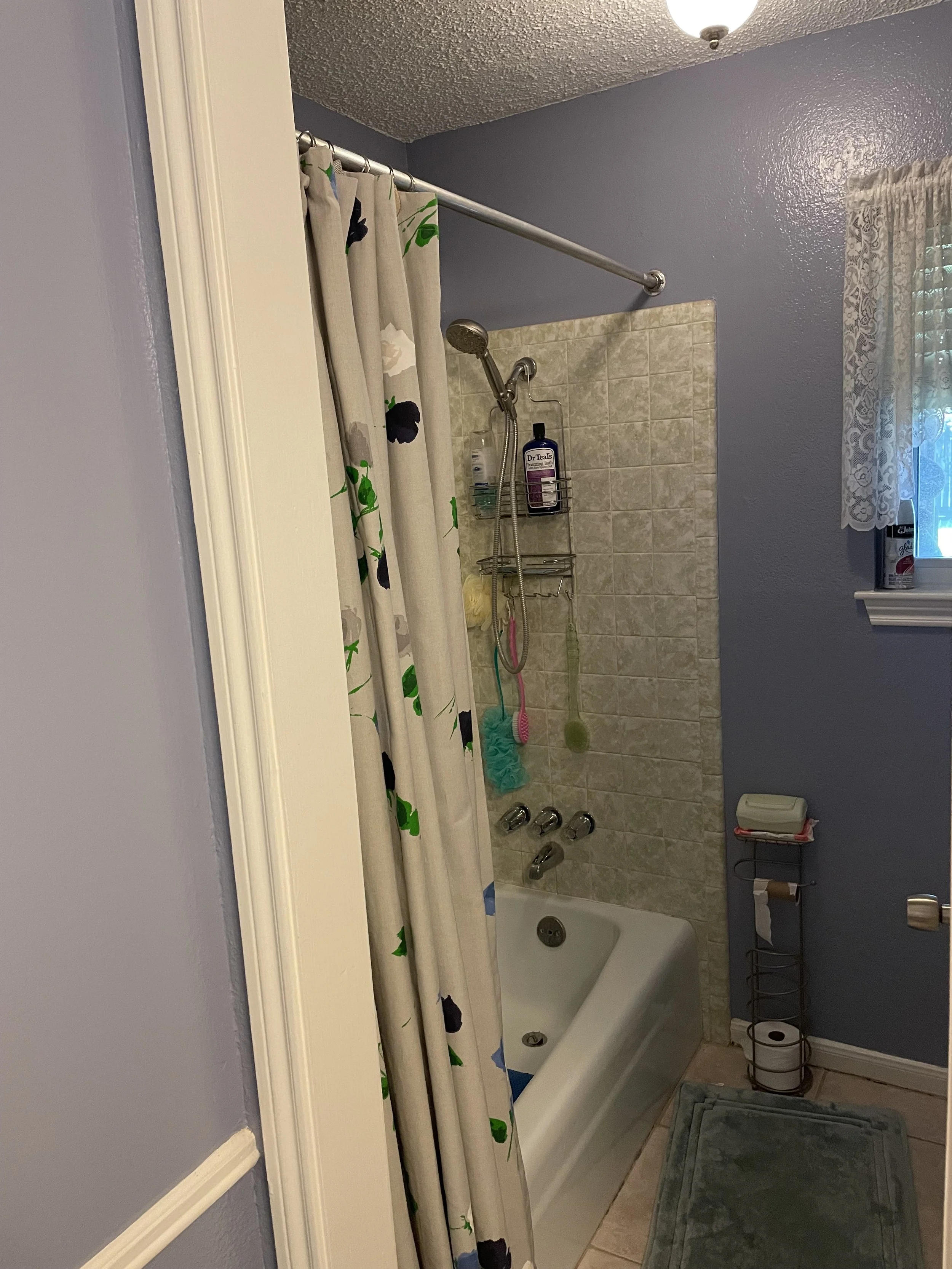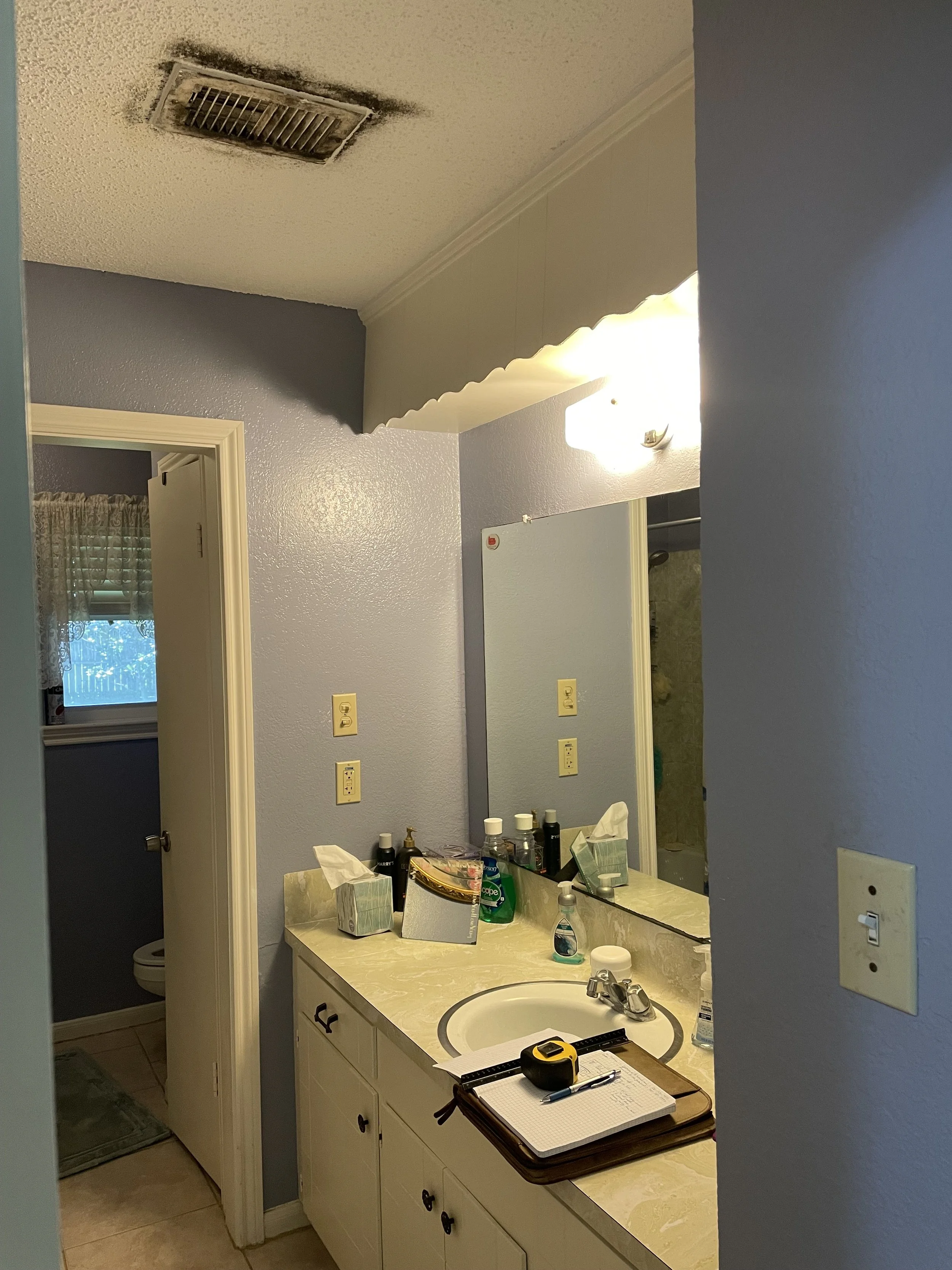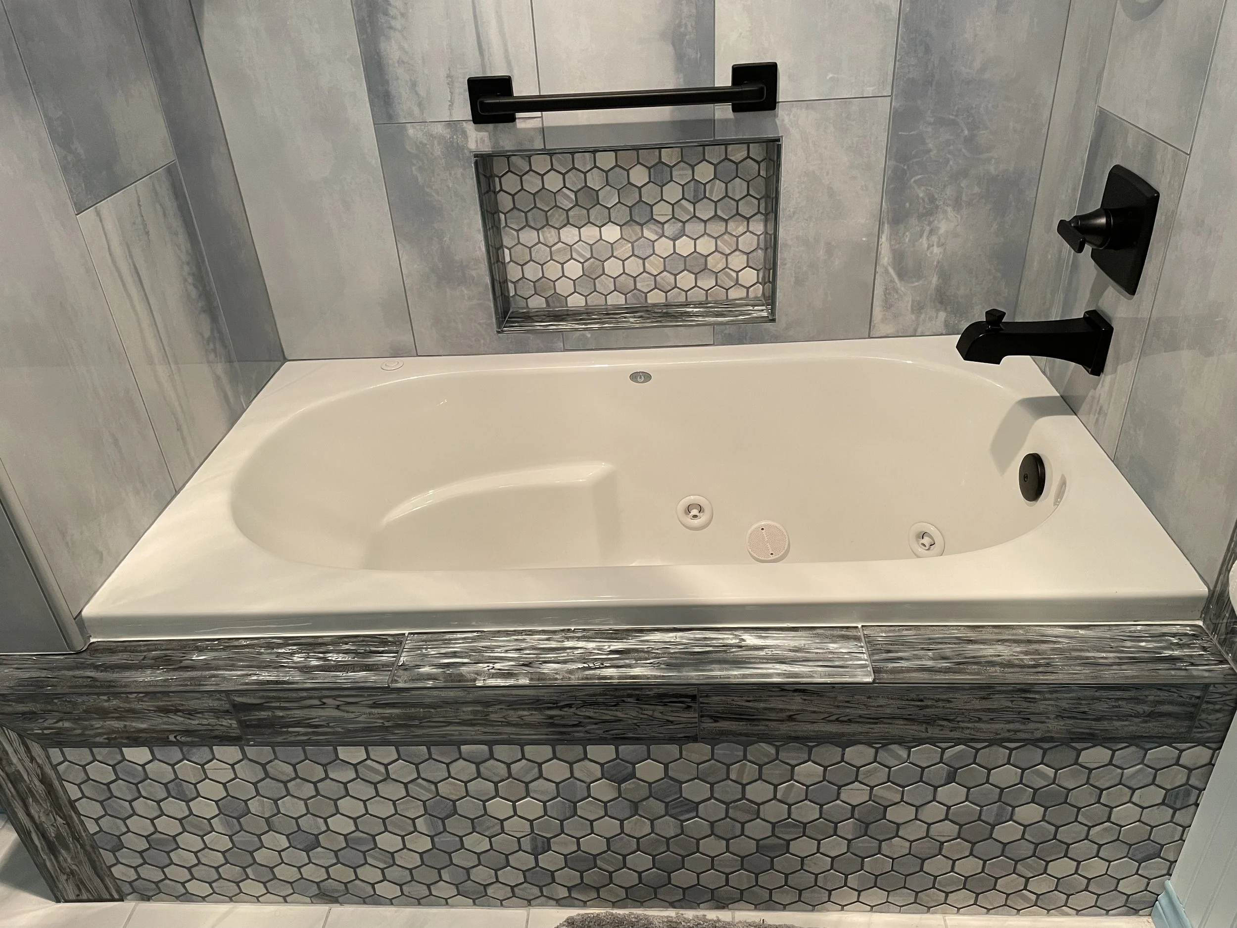 Creative tile choices make for a grand statement in this guest bathroom. Custom vanity, linen, and wainscoting with a bold color make for a fun and inviting bathroom.