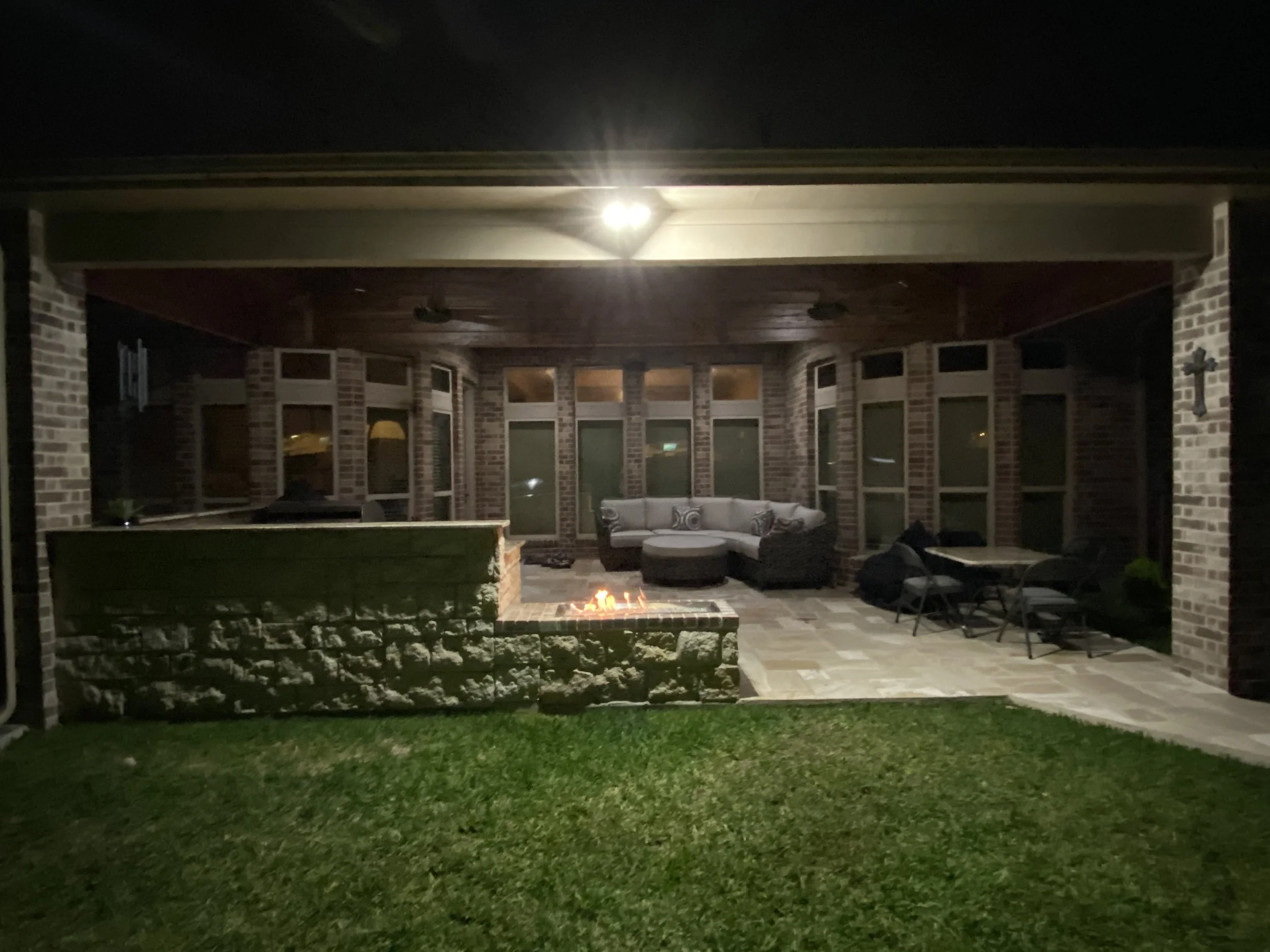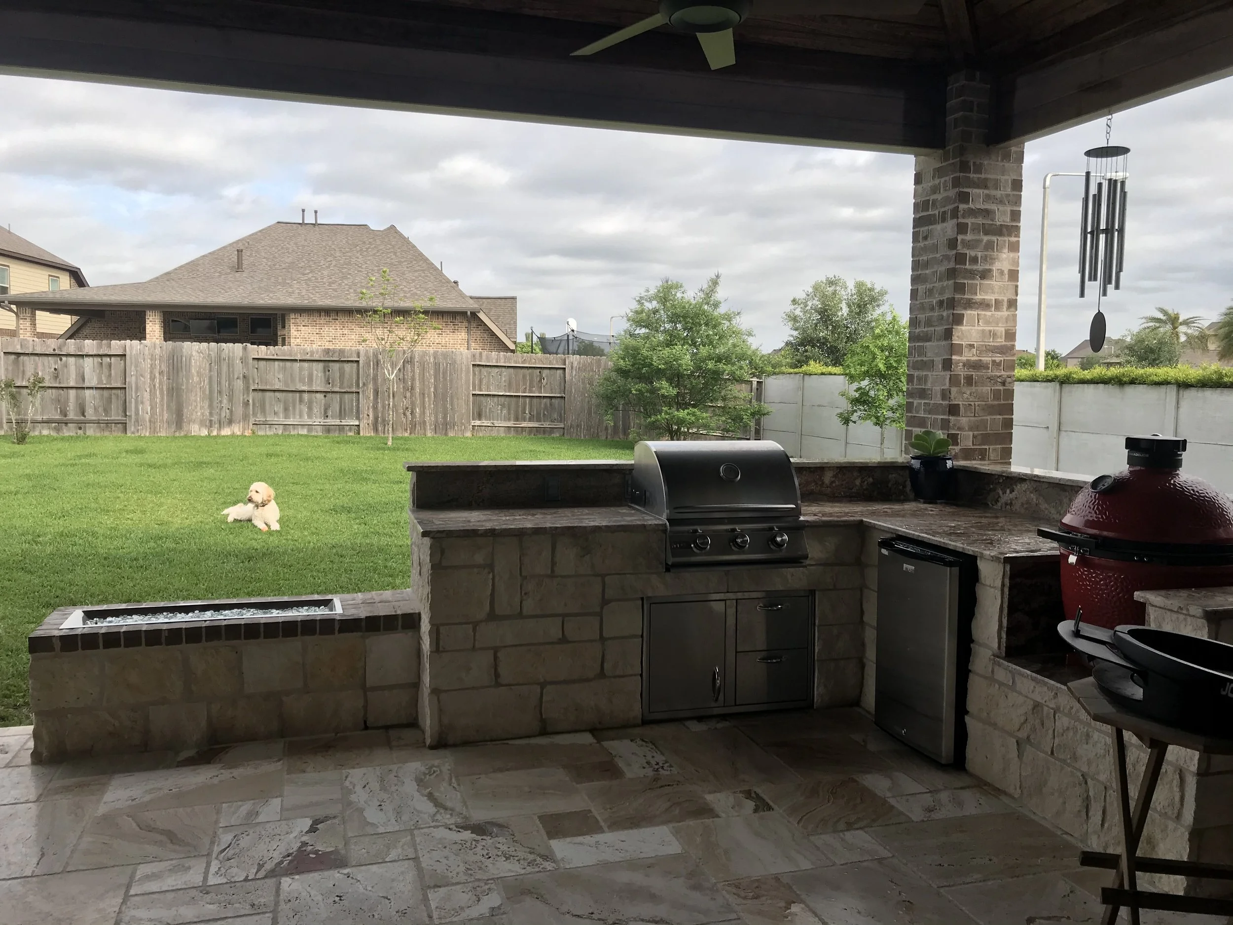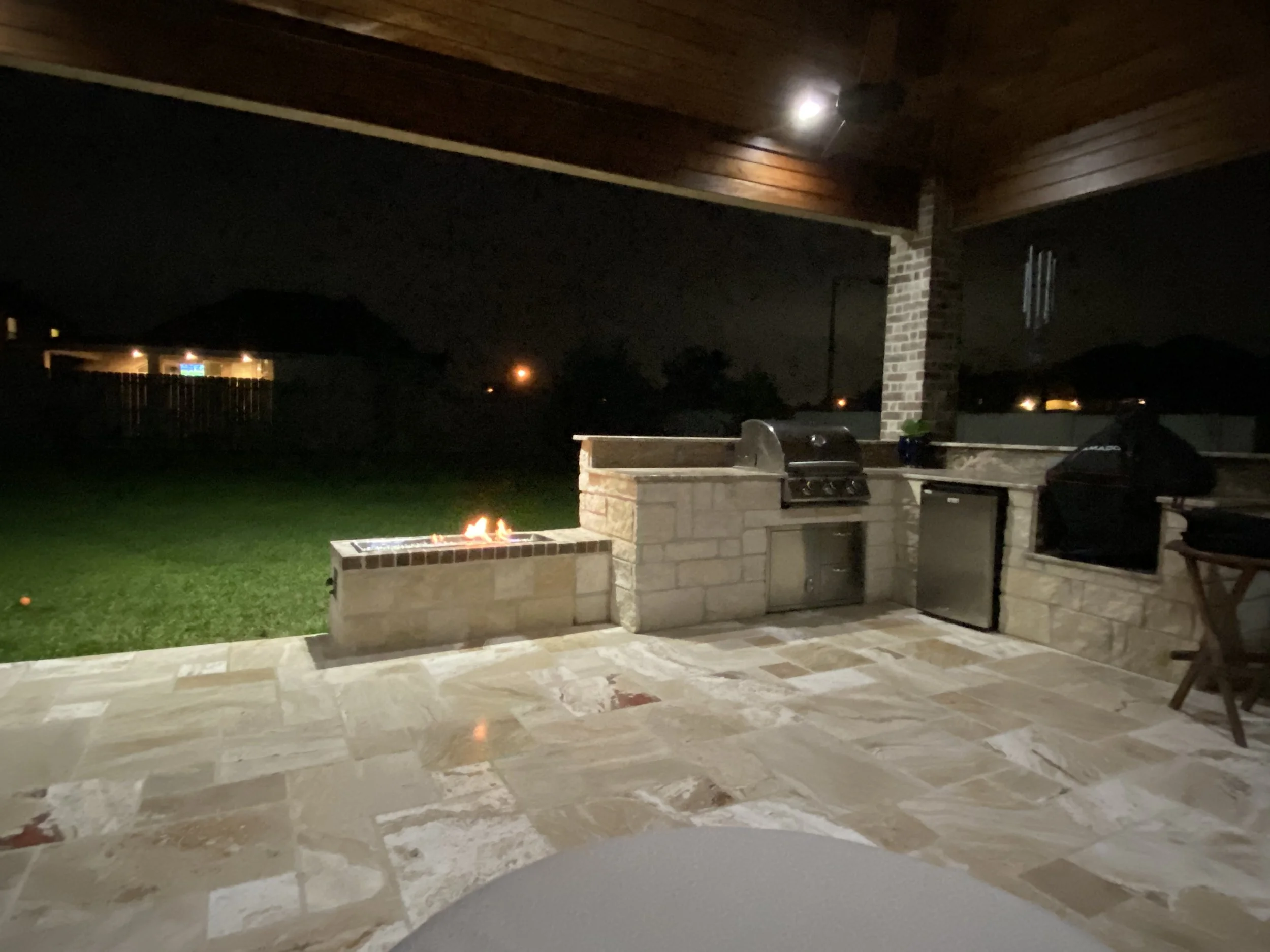 With next to no cover it sure was hard to enjoy a nice time cooking outside. Not anymore! Look at all that counter space and grilling options! Even a fun fire feature to enjoy in the evening darkness.